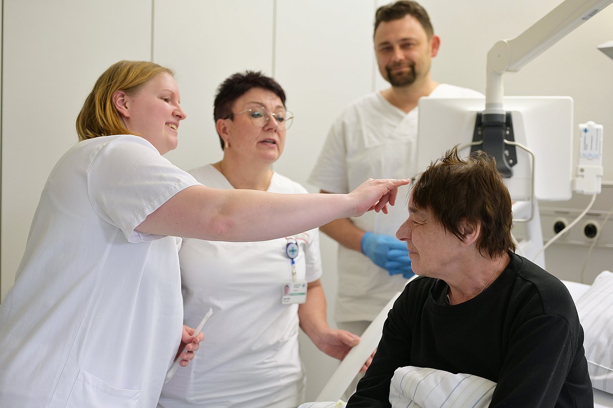 „Das ist eine der schönsten Stationen, auf denen ich bisher gearbeitet habe“, sagt Michaela Schorr, Auszubildende im dritten Ausbildungsjahr. „Hier wird sich richtig Zeit für uns genommen. Wir dürfen alles sehen, was wir wollen, und auch alles selbst machen: den Patienten und seine Vitalwerte im Blick behalten, Verbände wechseln, Wunden dokumentieren, Flüssigkeitshaushalt und Urinmengen überprüfen und so viel mehr. Dadurch lernen wir sehr intensiv und übernehmen früh Verantwortung.“ Weitere typische Pflegetätigkeiten in der Neurochirurgie sind etwa die Überprüfung von Durchblutung, Motorik und Sensibilität sowie die Kontrolle der Pupillen. „Dabei leuchten wir mit einer kleinen Lampe nacheinander in beide Augen und beobachten die Reaktion der Pupillen. Diese sollten sich dabei schnell und gleichmäßig zusammenziehen“, erläutert Michaela Schorr. Sie und die anderen Nachwuchskräfte werden von Stationsleitung Olga Oliger sowie anderen pädagogisch geschulten Pflegefachpersonen – den Praxisanleiterinnen und -anleitern – betreut. Aber auch das restliche Stationsteam und andere Auszubildende stehen den Neulingen helfend zur Seite. Das hat den Vorteil, dass die Auszubildenden auch füreinander Mentorinnen und Mentoren sein können: Sie geben ihr Wissen an andere weiter, festigen so ihre eigenen Kenntnisse und lernen, zu delegieren.